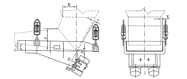 本系列電機(jī)振動(dòng)給料機(jī)設(shè)計(jì)時(shí)未考慮倉(cāng)壓的影響,為保證給料機(jī)的正常運(yùn)行,必須盡量減少倉(cāng)壓對(duì)給料機(jī)的影響。因此在設(shè)計(jì)溜嘴時(shí),應(yīng)用溜嘴的后側(cè)板承擔(dān)料柱的垂直壓力。溜嘴形式及配置可參考圖及表中數(shù)值。